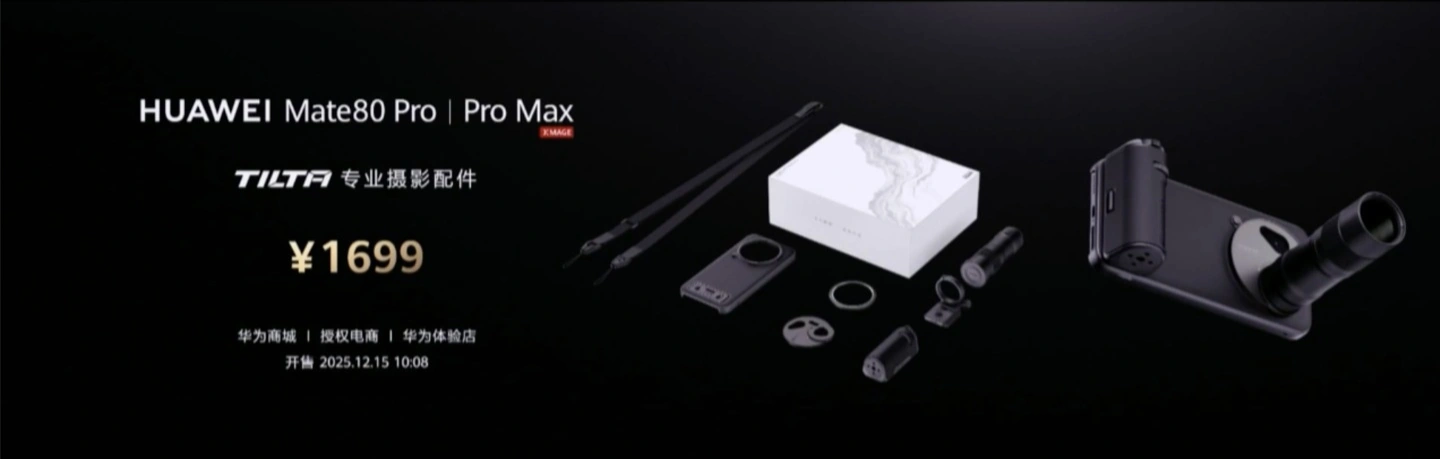 另外,适配华为 Mate 80 系列手机的 TILTA 专业摄影配件售价 1699 元,内置 3.3x 增倍镜和快拆拓展配件,将于 12 月 15 日开售。